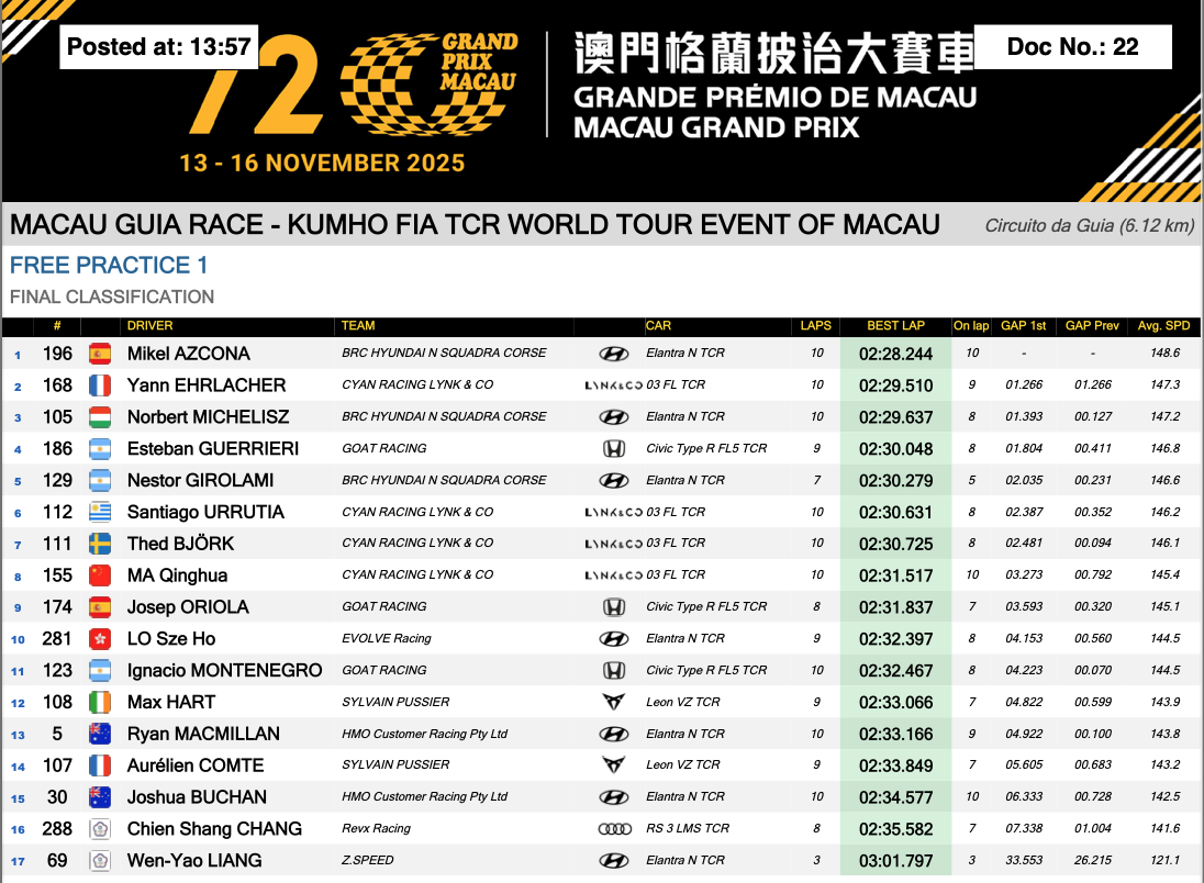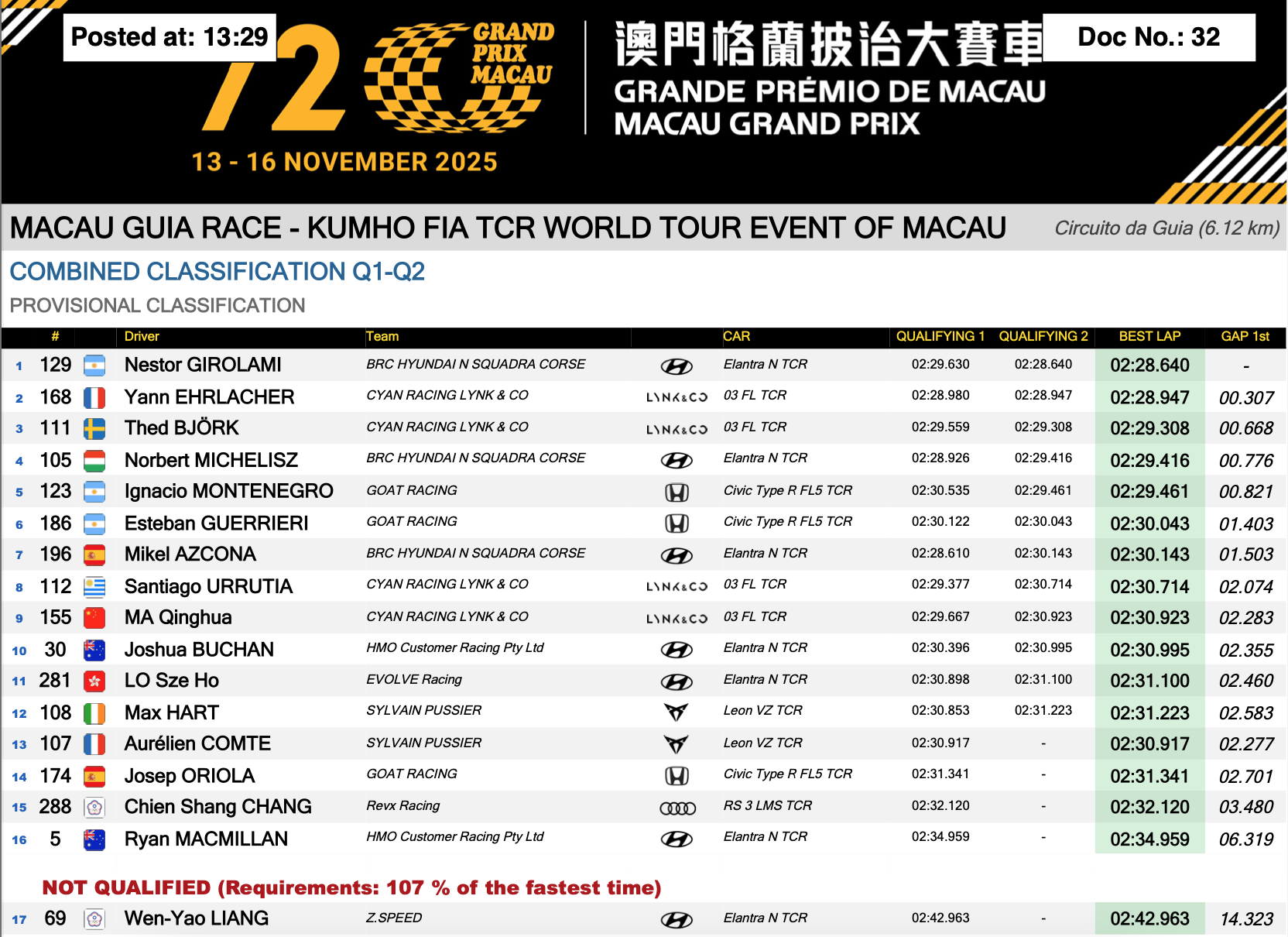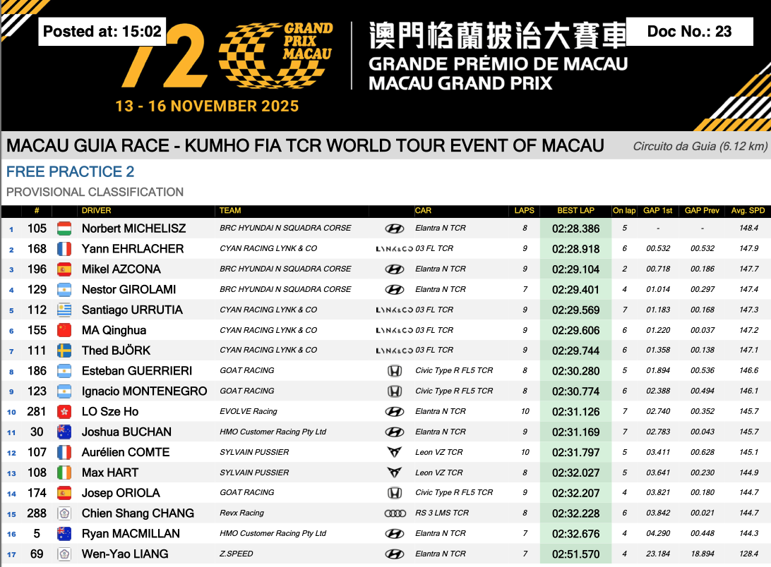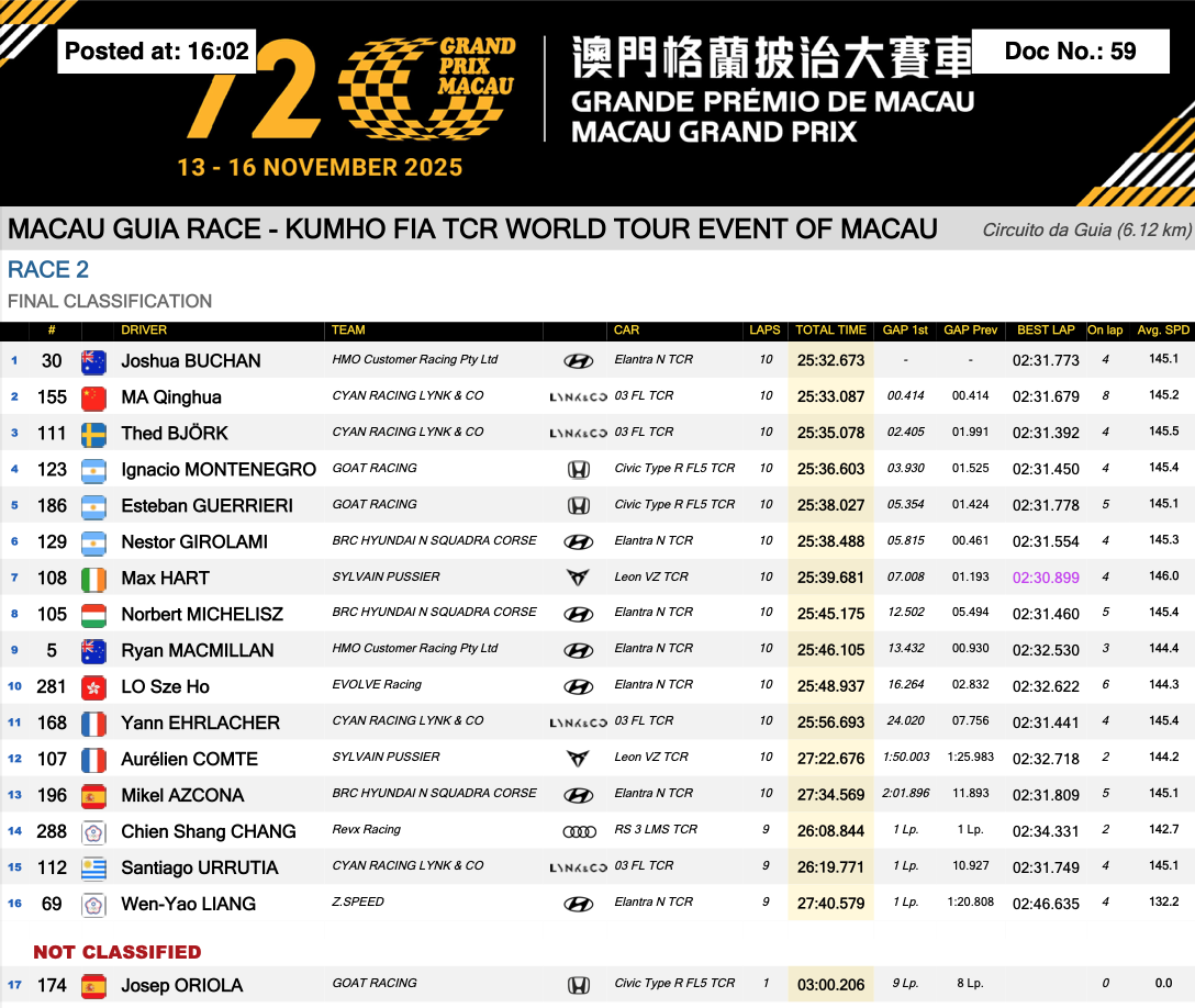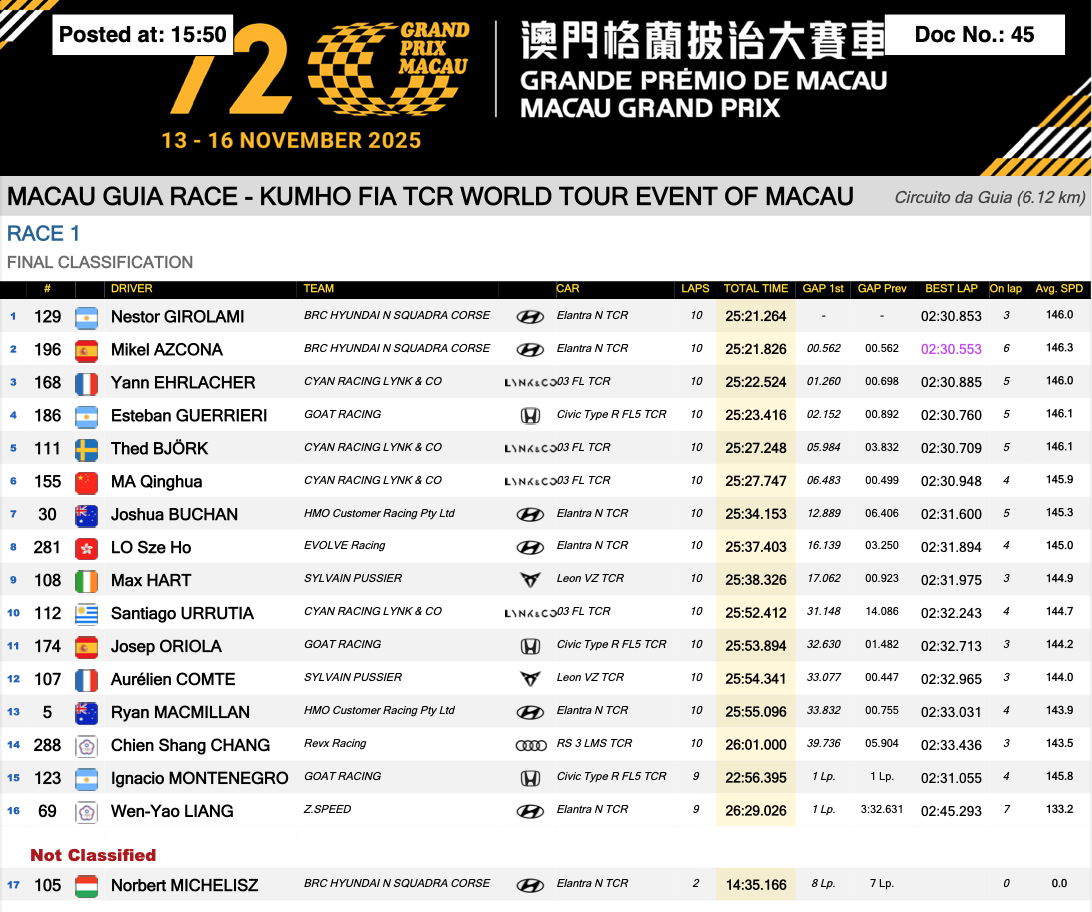 V posledním kole se do problému dostal novopečený šampion Yann Ehrlacher, kdy po souboji s Michelizsem nedobrzdil v zatáčce u hotelu Lisabon a musel couvat. Nakonec je klasifikován až na jedenáctém místě.